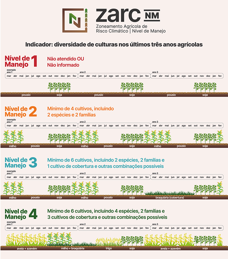 Por outro lado, os níveis seguintes (NMs 3 e 4) pressupõem melhorias na fertilidade química, física e biológica do solo, por intermédio do aprimoramento das práticas de manejo. Dessa forma, esses manejos aumentam a disponibilidade hídrica e, assim, reduzem os riscos de falta d’água às culturas.